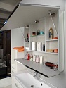 Внутренняя структура шкафа включает три стеклянные полки, рационально распределяющие пространство для хранения различных категорий предметов. Двухсекционная компоновка с двумя независимыми подъемными механизмами обеспечивает гибкость в использовании и доступ к содержимому. Наличие встроенной розетки добавляет модели бытовую универсальность, позволяя подключить электроприборы непосредственно в зоне умывальника. Система плавного закрывания гарантирует безопасную и бесшумную эксплуатацию фасадов, сохраняя целостность механизмов и поддерживая спокойную атмосферу в помещении.