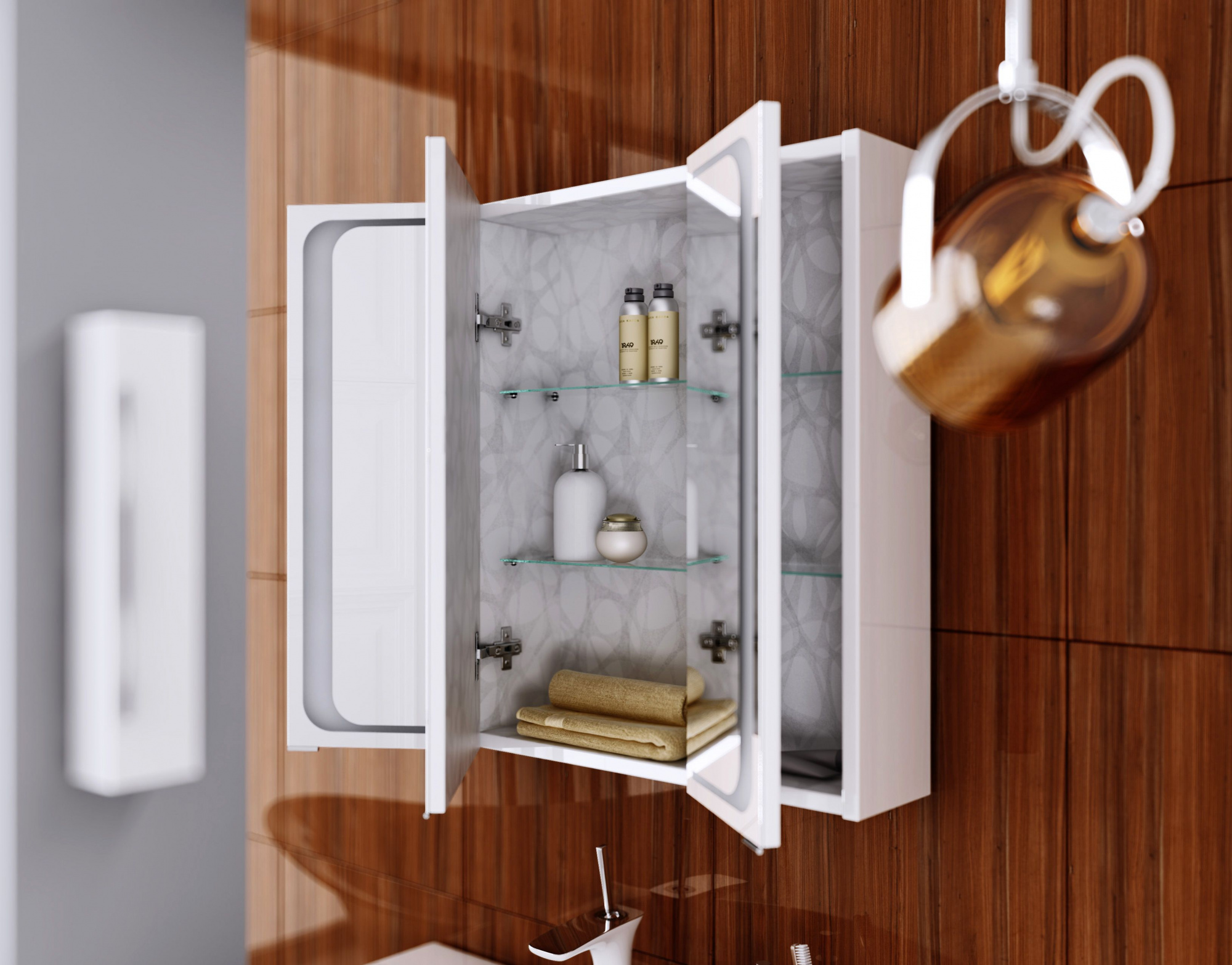 Модель оснащена дверцами, закрывающими внутренние отсеки для хранения. Система хранения рассчитана на размещение средств гигиены, лекарственных препаратов, косметических принадлежностей и мелких аксессуаров. Такая конструкция позволяет держать содержимое в порядке и защищает предметы от попадания влаги и пыли. Петли и ручки выполнены из хромированной фурнитуры, устойчивой к коррозии и истиранию, что обеспечивает продолжительный срок службы без снижения функциональности. Дверцы открываются плавно, при этом конструкция гарантирует надежное удержание в закрытом положении. Внутреннее пространство организовано так, чтобы разместить предметы разного размера, что повышает удобство эксплуатации. Гладкая поверхность корпуса и дверей легко очищается влажной тканью, не требует применения агрессивных средств.