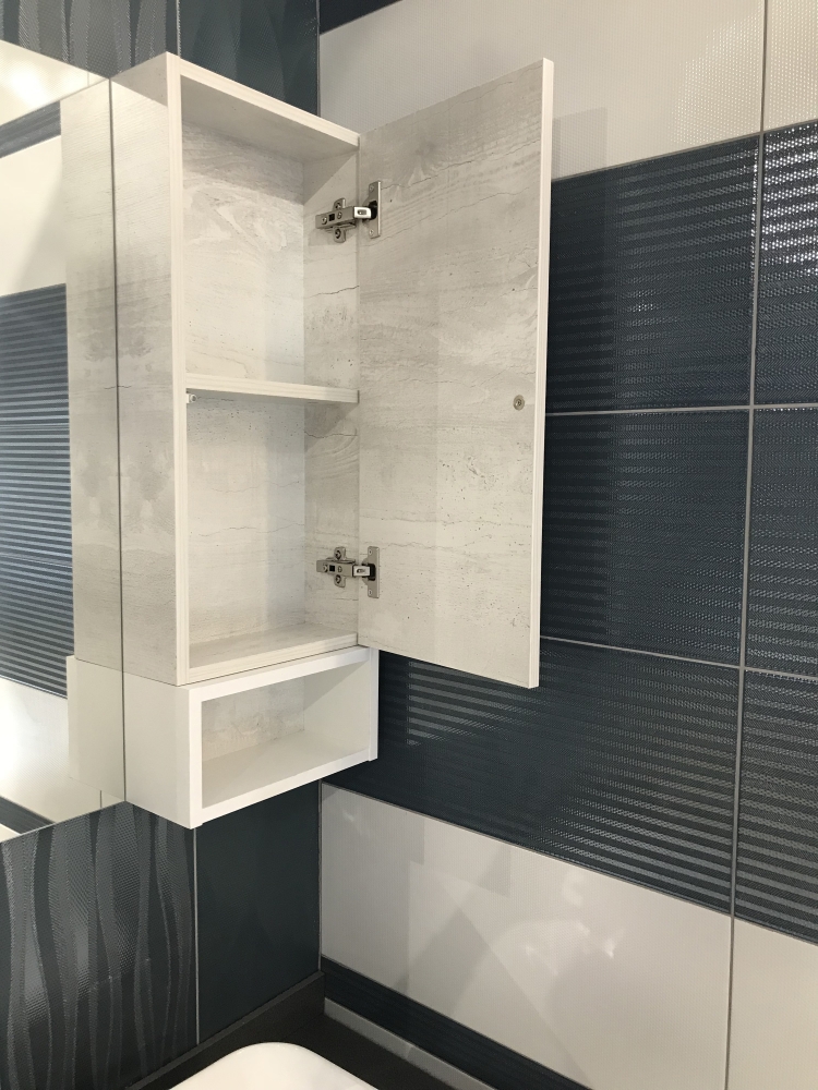 Фасад и корпус изготовлены из ДСП, дополненного ламинированным матовым покрытием, устойчивым к влаге и механическим нагрузкам. Зеркальная панель совмещена с функциональной полкой, позволяющей хранить предметы, к которым нужен быстрый доступ. Внутреннее пространство организовано полками, скрытыми за дверцами, что дает возможность разместить косметику, средства гигиены или аксессуары в закрытом виде.