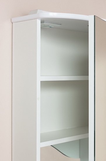 Конструкция шкафа демонстрирует продуманный подход к организации хранения. Распашной зеркальный фасад скрывает внутреннее отделение с двумя полками, обеспечивающими достаточно места для размещения банных принадлежностей. Дополнительная открытая полка в нижней части создает удобную зону для часто используемых косметических средств или декоративных элементов. Встроенный светодиодный модуль обеспечивает комфортное освещение в зоне умывальника, а наличие розетки позволяет подключить электроприборы непосредственно у зеркала. Система плавного закрывания гарантирует бесшумную работу дверцы и продлевает срок службы механизма.