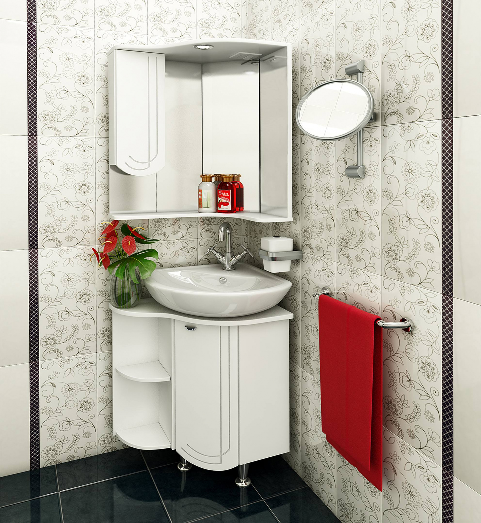 Внешний вид шкафа отличается современной лаконичностью. Глянцевые поверхности корпуса и фасада в белом цвете создают выразительный контраст с зеркальным полотном, визуально расширяя пространство. Использование ДСП с ламинированным покрытием для корпуса и МДФ с пленочной отделкой для фасада обеспечивает устойчивость к воздействию влажной среды. Качественные материалы сохраняют безупречный внешний вид при длительной эксплуатации. Угловая конструкция не только экономит пространство, но и создает эргономичную рабочую зону, где все необходимое находится в непосредственной близости. Сочетание компактных размеров, многофункциональности и стильного дизайна делает эту модель практичным решением для современных ванных комнат с ограниченной площадью.