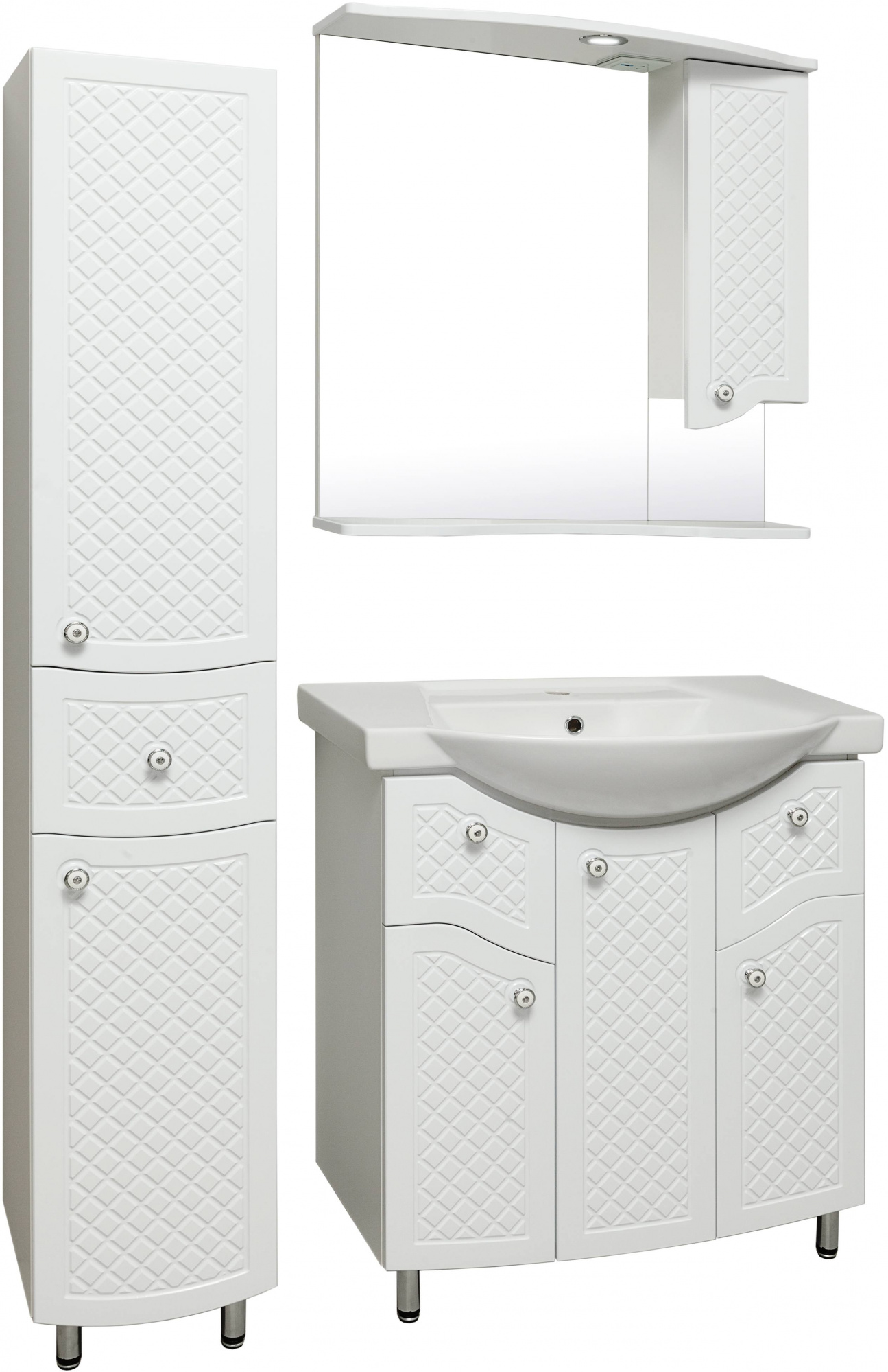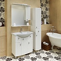 Модель отличает гармоничное сочетание матового покрытия корпуса и глянцевого фасада, создающее интересный визуальный диалог текстур. Цветовое решение с преобладанием белого цвета дополняется хромированной фурнитурой с белыми акцентами, что добавляет конструкции стильное звучание. Использование влагостойких материалов обеспечивает долговечность эксплуатации в условиях ванной комнаты: корпус из ДСП с ламинированным покрытием и фасад из МДФ с пленочной отделкой демонстрируют устойчивость к воздействию влажной среды. Годовая гарантия от российского производителя подтверждает надежность конструкции и качество исполнения.