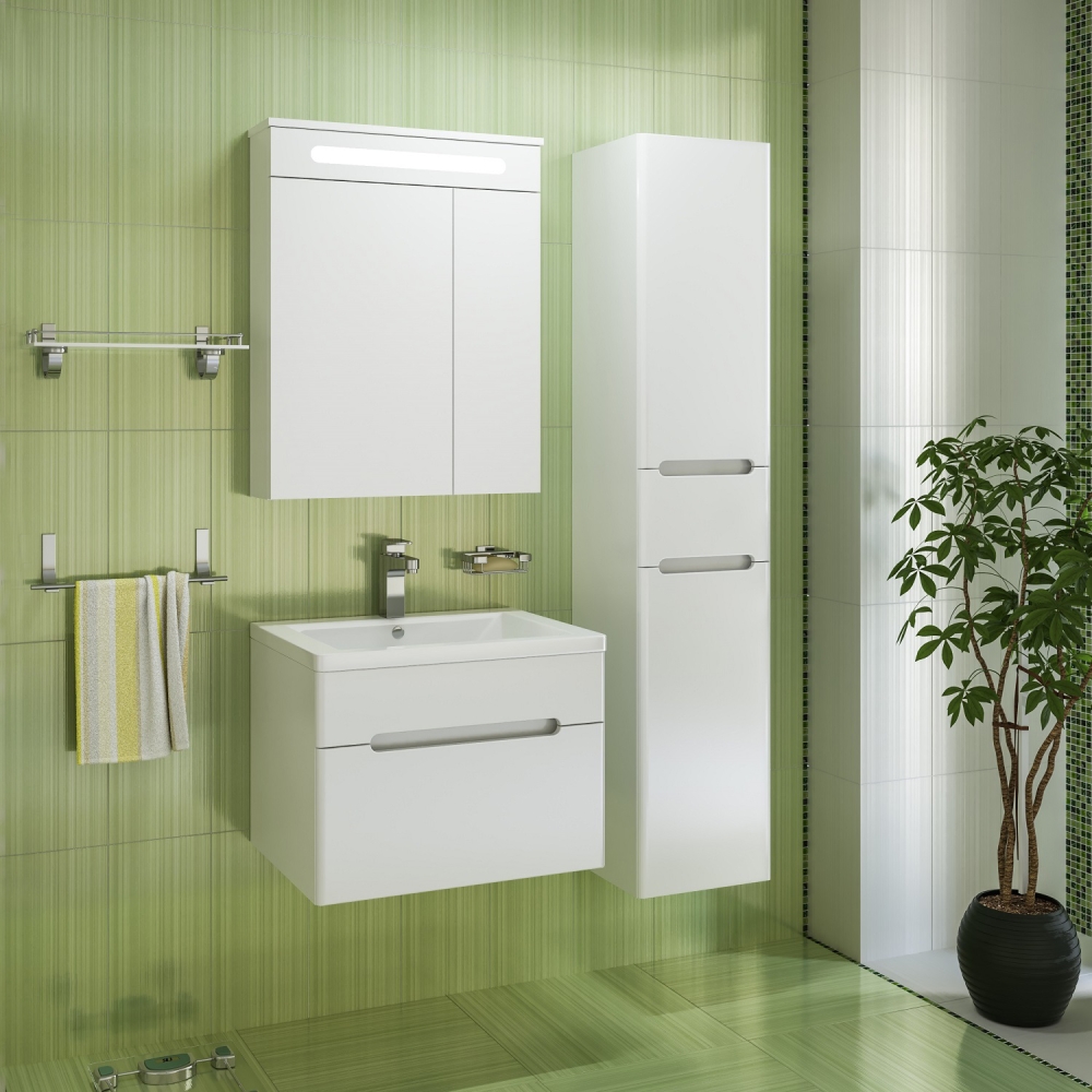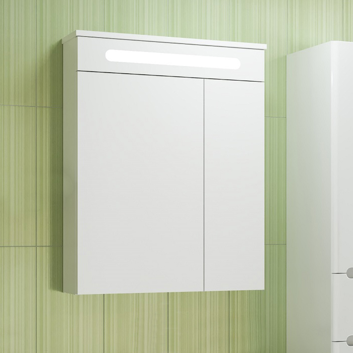 Шкаф оборудован встроенной подсветкой, управляемой электровыключателем, расположенным на корпусе для удобного доступа. Предусмотрена встроенная розетка для подключения электрических приборов, таких как фен, бритва или электрическая щетка. Система хранения организована с дверцами, внутри которых предусмотрены полки для косметических, гигиенических и бытовых принадлежностей. Продуманное расположение элементов позволяет рационально использовать пространство, обеспечивая удобство в повседневном применении. Механизм открытия дверок протестирован на долговременную эксплуатацию и отличается плавностью хода.