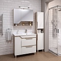 Конструкция шкафа демонстрирует устойчивость к эксплуатации в условиях повышенной влажности. Корпус из влагостойкой ЛДСП обеспечивает надежную защиту от воздействия пара и влаги, сохраняя стабильность геометрических параметров. Покрытие фасада износостойкой ПВХ-пленкой гарантирует сохранение эстетичного внешнего вида на протяжении длительного срока службы. Российское производство и годовая гарантия подтверждают контроль качества изготовления и применяемых материалов. Сочетание природной цветовой гаммы, продуманной асимметрии и проверенных влагостойких свойств делает эту модель практичным решением для современной ванной комнаты, где важны как эргономика, так и визуальная привлекательность.