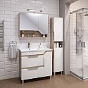 Асимметричная композиция модели предусматривает рациональное зонирование: правостороннее расположение шкафного блока с дверками сочетается с открытой зеркальной поверхностью, дополненной практичной полочкой. Такое решение позволяет эффективно распределить различные категории предметов – от повседневных гигиенических принадлежностей до декоративных элементов. Система плавного доводчика обеспечивает бесшумное и аккуратное закрывание дверц, продлевая срок службы фурнитуры и поддерживая спокойную атмосферу в помещении. Хромированные элементы фурнитуры добавляют конструкции современные акценты, подчеркивая чистоту линий и завершенность дизайна. Модель демонстрирует продуманный подход к организации пространства, где каждая деталь работает на общую функциональность.