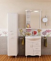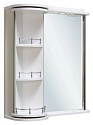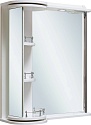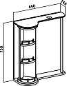 Особенностью модели является уникальная система хранения, сочетающая три открытые полки на вращающемся основании в нижней части и классический шкафный блок слева. Поворотные полки обеспечивают необычный и практичный доступ к содержимому, позволяя оптимально использовать глубину конструкции. Встроенная над зеркалом галогенная подсветка мощностью 20 Вт создает качественное освещение в зоне умывальника, а наличие розетки добавляет бытовую универсальность. Левостороннее расположение петель и шкафного блока формирует эргономичную рабочую зону, где все необходимое находится в непосредственной близости.