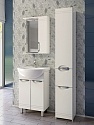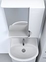 Конструкция шкафа демонстрирует продуманный подход к организации хранения в условиях ограниченного пространства. Модель сочетает закрытую систему хранения за дверцей с открытыми полками, что позволяет рационально распределить банные принадлежности и косметику. Встроенная подсветка типа спот обеспечивает направленное освещение в зоне умывальника, создавая комфортные условия для выполнения гигиенических процедур. Глянцевое покрытие корпуса и фасада не только придает изделию современный вид, но и способствует визуальному расширению пространства, отражая свет и создавая ощущение большей открытости.